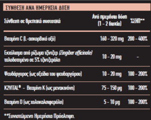 - Βιταμίνη C & Βιταμίνη D για την αντιοξειδωτική της δράση και τη συνεισφορά της στην ενίσχυση του Ανοσοποιητικού συστήματος