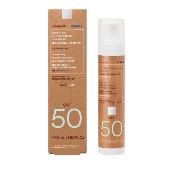 Ενισχυμένη με καινοτόμο δραστικό από βλαστοκύτταρα Κόκκινου Σταφυλιού και μίγμα βιταμινών, βοηθά στη μείωση της εμφάνισης ρυτίδων και πανάδων, χαρίζοντας λάμψη και ομοιόμορφο τόνο.Korres Red Grape Sheer Glow Antiageing & Antispot Daily Face Sunscreen Spf50, 50ml