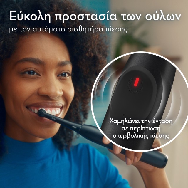 - Βοηθά στην ΠΡΟΣΤΑΣΙΑ ΤΩΝ ΟΥΛΩΝ ΣΑΣ με τον ΑΥΤΟΜΑΤΟ ΑΙΣΘΗΤΗΡΑ ΠΙΕΣΗΣ που μειώνει την ταχύτητα βουρτσίσματος και εμφανίζει κόκκινη ένδειξη όταν βουρτσίζετε πολύ δυνατά.